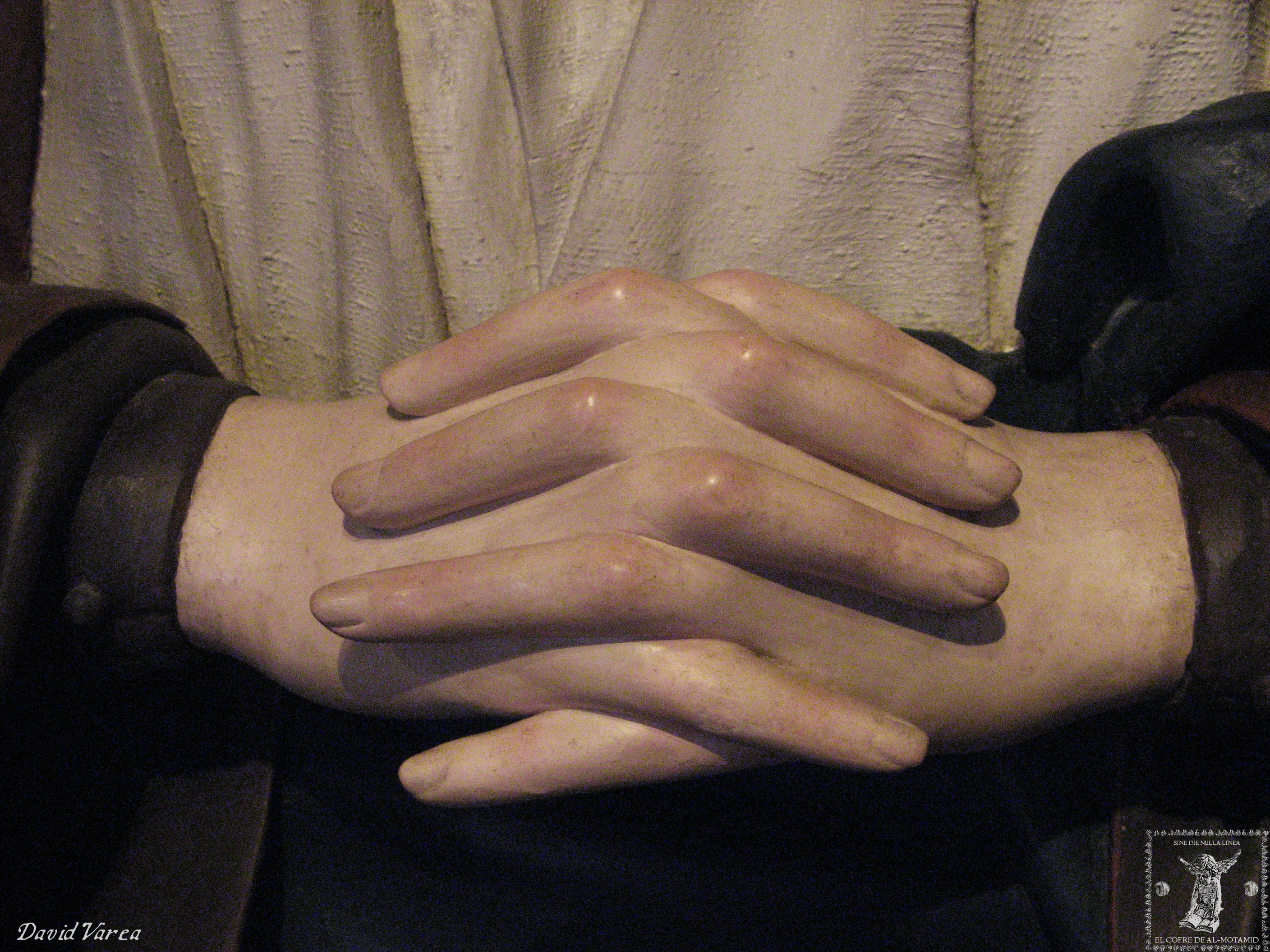 entrelazadas o superpuestas en actitud de oración o bien extendidas en gesto de imploración. Por último, el busto prolongado que es el más completo pues la figura arranca por debajo de las caderas. En este último se añade el sudario extendido, así como los clavos y la corona de espinas como atributos de la Pasión. La Dolorosa cisterciense y como es habitual en estas esculturas del artista, aparece vestida con manto azul sobre velo blanco y túnica de tonos rojizos por cuyas mangas asoman los puños de la camisa interior, dejando a la vista las delicadas manos entrelazadas en una inusual disposición horizontal con los dedos extendidos, en lugar de flexionados. Sin embargo, es en el rostro donde el escultor concentra toda la emotividad y el ensimismamiento de la figura a los que contribuye el gesto de las manos. Dolorosa de ritmos cerrados, de íntima plegaria conventual, de diálogo cerrado y silente en la oración del retiro. Dos tesoros de la imaginería pasionista que poco a poco van saliendo de su propia clausura.