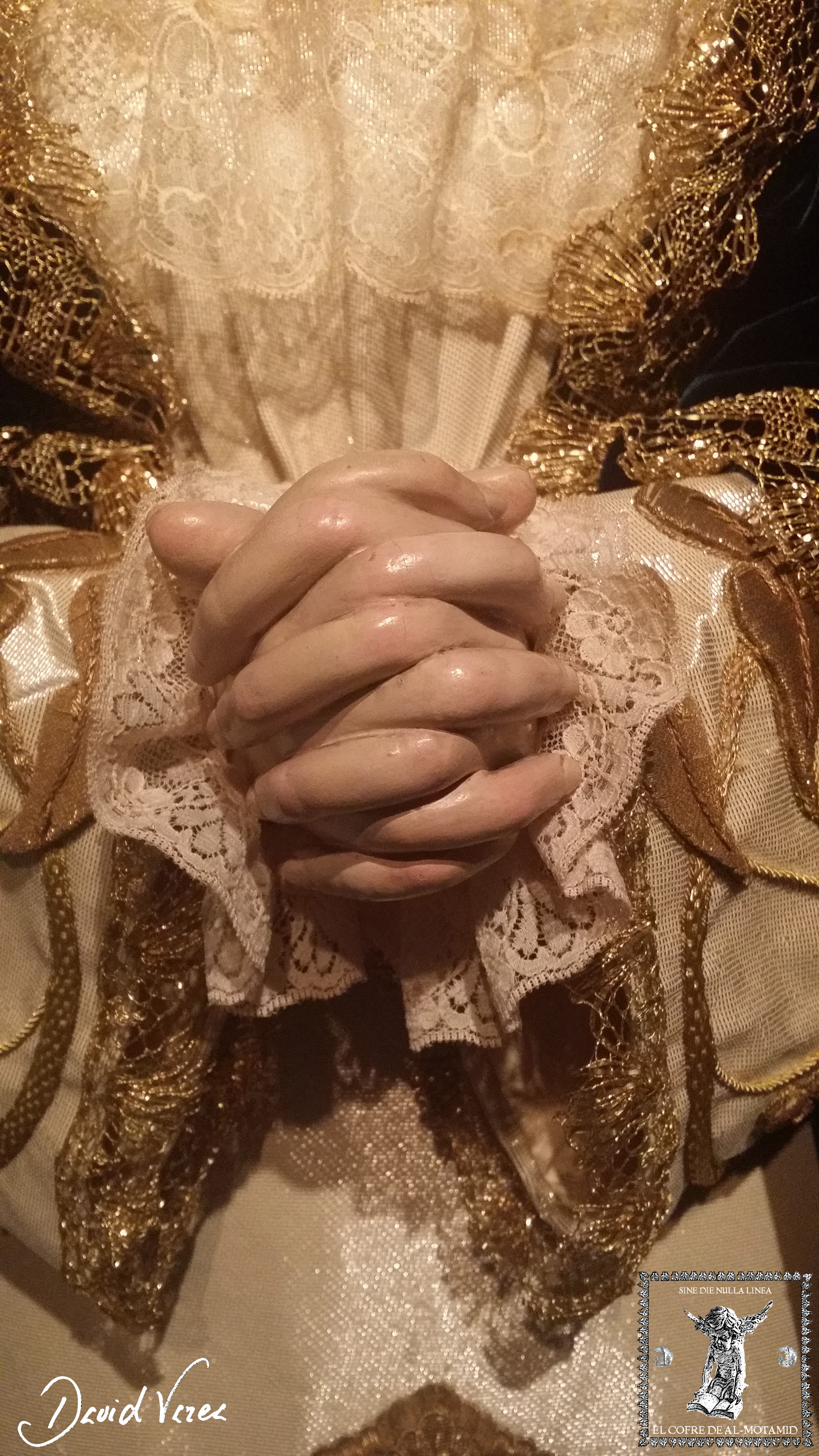fragilidad natural que con un verdadero estado de tensión dramática (5). Fue un artista nómada que contó con taller propio abarcando una clientela más amplia, repartida por distintas provincias de la región andaluza (6). A su mano se han atribuido la Virgen de los Dolores de la iglesia de San Juan (h. 1760-75), la primitiva Virgen del Amor Doloroso de la parroquial de los Santos Mártires (1771), la Virgen de Fe y Consuelo de la ermita del Monte Calvario (1770-71) y la Dolorosa del Císter (1770-71) que nos ocupa. En cuanto a Vicente Asensio de la Cerda, hijo de Pedro, quien tomaría el prototipo fijado por su progenitor para readaptarlo a sus gustos personales mediante una marcada tendencia volumétrica e incipiente prognatismo (7), podemos destacar su Virgen de los Dolores de la iglesia de San Pedro (1775-83) venerada por la cofradía de la Expiración o la Virgen Dolorosa que perteneció a la familia Yébenes donada a la congregación de Mena en 2010 (8) conservada en los columbarios de la corporación. De ahí que anteriormente hiciésemos hincapié en estos dos obradores con una personalidad marcada y definida: el primigenio abierto por Pedro Asensio de la Cerda cuya línea continuaría su hijo Vicente y un segundo liberado de los postulados del artista fundador regentado por Antonio Asensio de la Cerda quien, sin renunciar al modelo impuesto por su hermano, quiso dotar sus obras de un carácter más primoroso optando -como se ha visto- por un modelo de mujer más joven, de facciones delicadamente descritas y dolor introvertido, acentuados por una pristinación aporcelanada.
