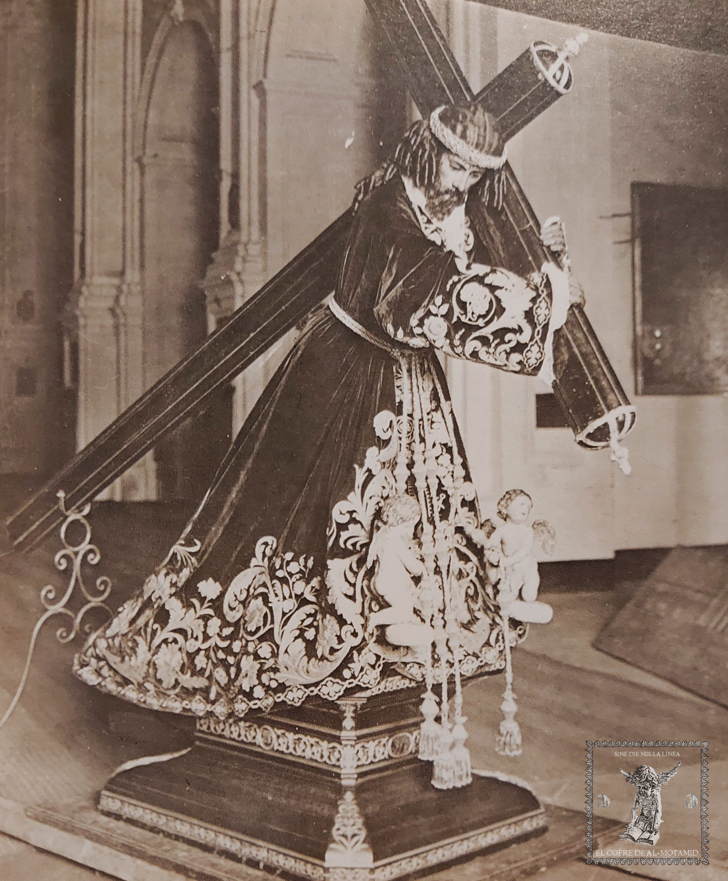 De esta guisa la admiraba Antonio Baena en su capilla de la iglesia de la Merced cuando la visitaba para orar ante su Cristo de la Sangre, o para atender los asuntos cotidianos que requerían su cargo de hermano mayor. Y es que, recordemos que el recordado cofrade, una vez accede a presidir la archicofradía de la Sangre en 1920, toma la decisión de acometer una serie de reformas con el propósito de engrandecerla y llevarla a altas cotas de esplendor, objetivo que, sin duda, fue alcanzando de manera paulatina y rutilante hasta resultar abruptamente interrumpido como consecuencia de los sucesos de 1931.